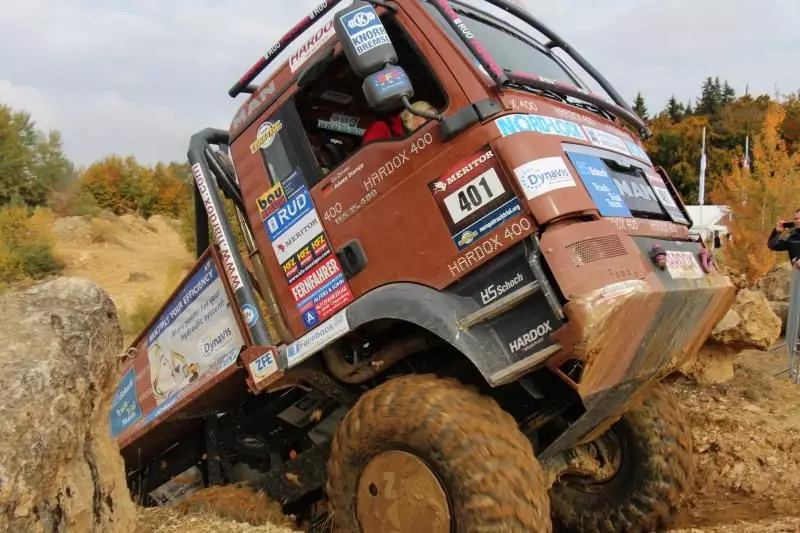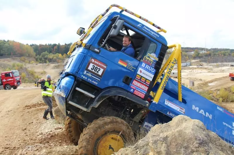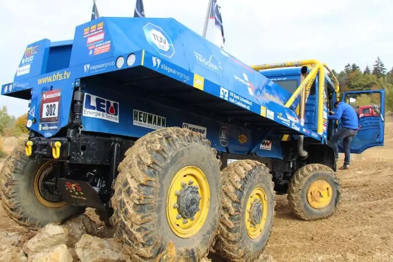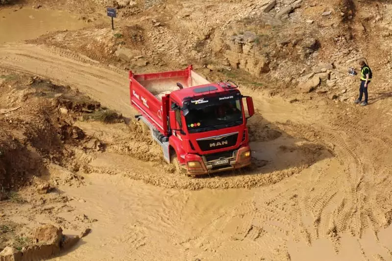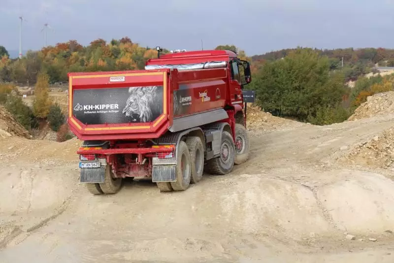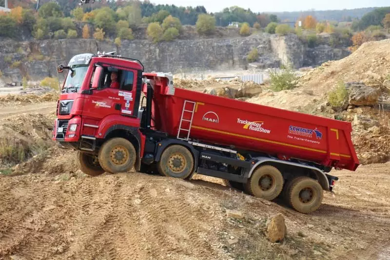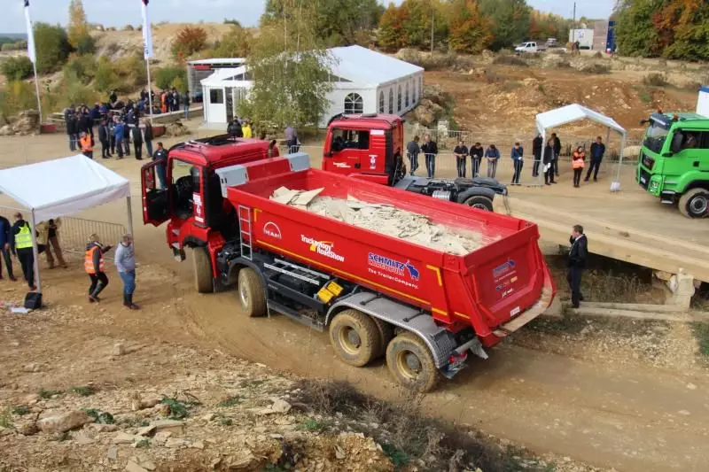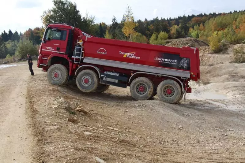 Das Unternehmen hatte das Gelände des Offroad-Parks Langenaltheim dabei in mehrere Stationen unterteilt. Während der Testfahrten erklärte das Personal die Ausstattungen wie die Lenkbremse, Kletterbremse und Fertigerbremse. Die Lenkbremse dient dazu, das Untersteuern, also das Schieben über die Vorderräder bei Kurvenfahrt im Gelände, durch selektiven Bremseingriff an den kurveninneren Hinterrädern zu verringern. Dadurch wird der Radius der gefahrenen Kurve kleiner. Die Kletterbremse erleichtert das Anfahren am Berg. Durch Aufrechthaltung des Bremsdruckes wird ein Zurückrollendes Fahrzeug verhindert. Die Fertigerbremse hält automatisch einen voreingestellten Bremsdruck für den Anfahr- und Schiebevorgang an der Straßenfertigermaschine. Dann rollt der Kipper auf Gefällestrecken nicht davon.