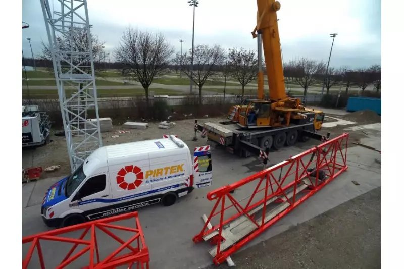 Prozentual betrachtet sind es folglich etwas mehr als 1 Prozent der Hersteller, die Probleme bei der Inbetriebnahme der Hydraulik haben und dann auf die Hilfe des Unternehmens angewiesen sind. Der mobile Service ist mit einem voll ausgestatten Werkstattwagen nicht nur auf der Bauma unterwegs, sondern verspricht, bundesweit innerhalb einer Stunde nach Auftragseingang vor Ort zu sein. Gewährleistet wird dies durch ein Netz von etwa 62 Service-Zentren die über ein zentrales Büro gesteuert werden. Dabei kann nicht nur telefonisch, sondern auch über eine App Hilfe angefordert werden. Dass es für diesen Service auf der Bauma großen Bedarf gibt zeigen die vielen Einsätze, für die die Hydraulik-Spezialisten gerufen werden. Am Tag des Redaktionsbesuchs auf dem Messegelände riss ein Kühlwasserschlauch am Schmidbauer-Mobilkran. Auch hier konnte die Pirtek Niederlassung München-Ost weiterhelfen. Innerhalb kurzer Zeit wurde Ersatz beschafft, ein Schlauch gangbar gemacht, angeschlossen und mit Schlauchklemmen gesichert. Ein Video vom Bauma-Aufbau (Stand Dezember) gibt es in der Treffpunkt.Bau-App sowie auf der Homepage in der Treffpunkt.Bau-Videothek.