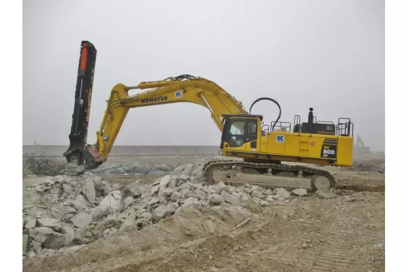 Der Fallgewichtshammer besitzt im Gegensatz zu herkömmlichen Hammern eine gigantische Einzelschlagenergie. Er kommt zum Einsatz, wo normalerweise gesprengt werden muss, um die Struktur selbst von kompaktem Fels oder Beton bis in 4 m Tiefe zu zerstören. Das Fallbeil wird in Steinbrüchen eingesetzt, wo nicht gesprengt werden darf, oder zum Abbruch von extremen Fundamenten wie beispielsweise in Industrieanlagen und Kraftwerken aller Art. Bei der Bearbeitung durch den Hammer wird die Struktur des Betons zerstört, sodass sich Beton und Armierungseisen leichter voneinander trennen lassen. Da der eingesetzte Terminator ein Eigengewicht von 10,5 Tonnen besitzt, musste das Trägergerät entsprechend groß konzipiert sein. Da mindestens 85 Tonnen gefordert waren, setzte die Karl-Gruppe einen Komatsu PC 800 LZ mit 90 Tonnen Betriebsgewicht ein. Die zertrümmerten Teile wurden im Anschluss von einem Liebherr R974C rausgezogen.