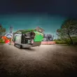 Die neue Woodking Slim complete ist mit drei großen, hartmetallbestückten Spezial-Sägeblättern ausgestattet, die einen sauberen, geraden Schnitt von Hölzern bis 250 mm Durchmesser garantieren. Ihr Durchmesser beträgt 700 mm, je 60 Zähne arbeiten präzise, sodass sich das Anbaugerät auch für feine Arbeiten, etwa den Schnitt von Sträuchern und Gestrüpp, eignet. Dank ihres Keilriemenantriebs läuft die Säge sehr ruhig. Sie kann an Front-, Rad- und Teleskoplader angebaut werden. Fliegl hat die Woodking Slim complete im Dialog mit Anwendern entwickelt, deren Praxiserfahrung in die Konstruktion des flachen Sägekopfs mit eingeflossen ist.