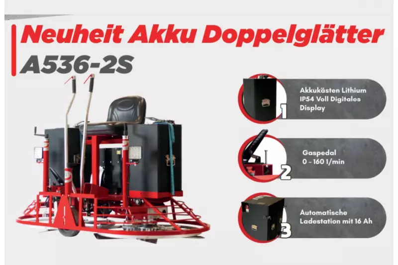 Und: Mit einem Dauerschalldruckpegel von gerade mal 60 dB(A) und keinerlei Abgasemissionen kann der Akku-Doppelglätter auch in geschlossenen Räumen eingesetzt werden. Die leistungsstarke, ergonomisch konstruierte Glättmaschine genügt dem Hersteller zufolge höchsten Ansprüchen und ist ideal zum Scheiben und Glätten von Estrich- und Betonböden. Sie garantiert ein Höchstmaß an Wirtschaftlichkeit, Sicherheit und Bedienkomfort.