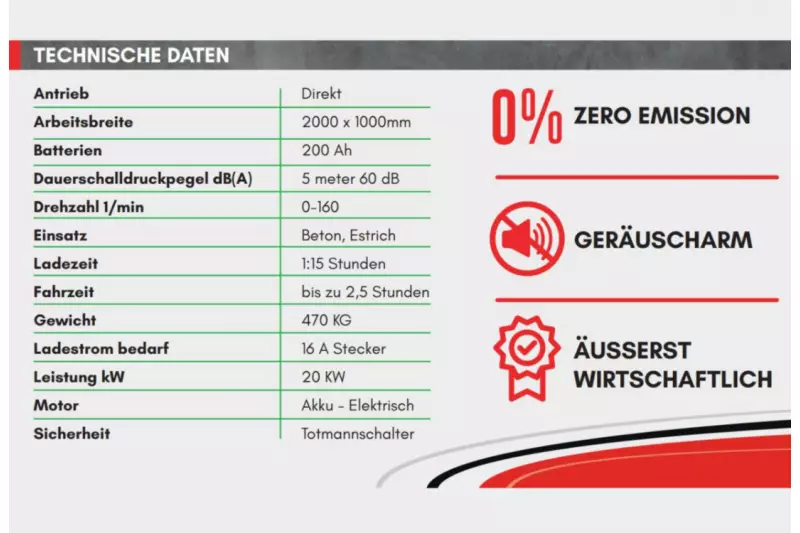 Der Akku-Doppelglätter punktet durch „Zero Emission“, also durch nahezu null Lärm- und Abgasemissionen. Das ist im Bereich der Betontechnik, in der es bislang nur Alternativen mit Verbrennungsmotor gab, einzigartig.