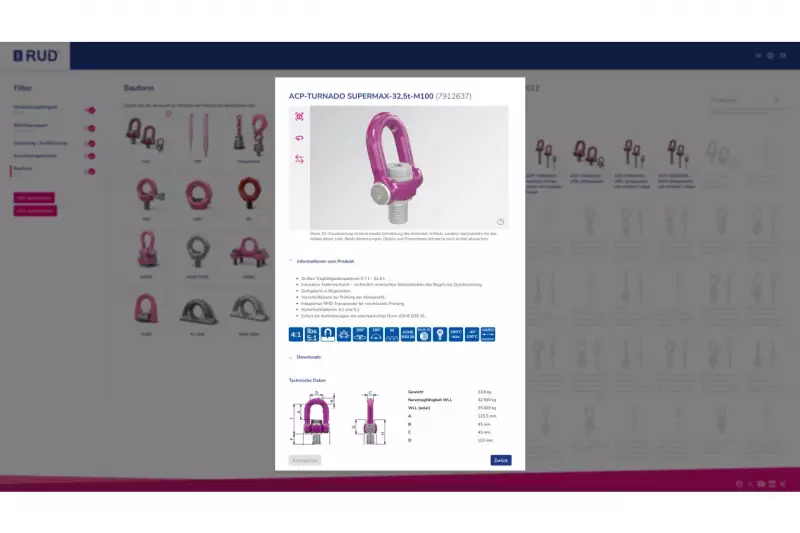 Das Unternehmen RUD komplettiert sein Angebot an digitalen Tools zur anwendungsorientierten Zusammenstellung von Hebelösungen: Ergänzend zum bewährten Anschlagmittel-Konfigurator steht jetzt zusätzlich auch ein Anschlagpunkte-Konfigurator zur Verfügung. Mit seiner Hilfe lassen sich nun schnell und unkompliziert die passenden Anschlagpunkte für kundenindividuelle Kettengehänge finden und sogar in 3D visualisieren.