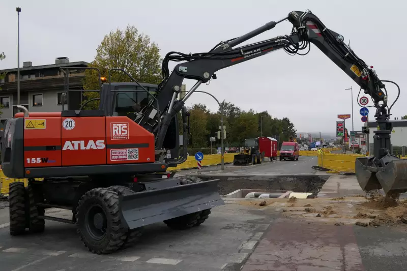 In Bielefeld in der Eckendorfer Straße müssen drei große Versorgungsschächte der Stadtwerke erneuert werden. Dazu wurde die Hauptverkehrsstraße auf eine Spur eingeengt. Bei den Arbeiten in und an den drei Schächten muss präzise gearbeitet werden, zumal es wenig Bewegungsfreiheit gibt. Im Einsatz für die Firma Rohrnetz-Technik Schaumburg ist ein Atlas 155 W Mobilbagger.